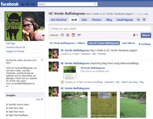 Sooo I made a California Buffalograss Faceboo Fan Page!!! Woohoo! Still figuring out all the plugins and this and that you can do though. I know how to navigate my personal page just fine, but this fan page thing is all new to me.
