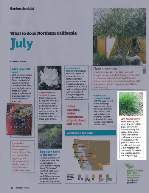 California Buffalograss was mentioned in the June 2010 issue of Sunset Magazine as a great low-water lawn alternative! We had sent them samples to try out last year through one of our brokers and here is what they have to say about it: “We grew it at Sunset and loved its soft feel and 6-inch height (if left unmowed)”.